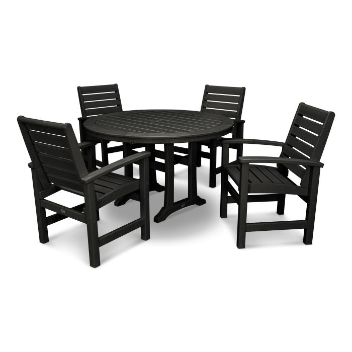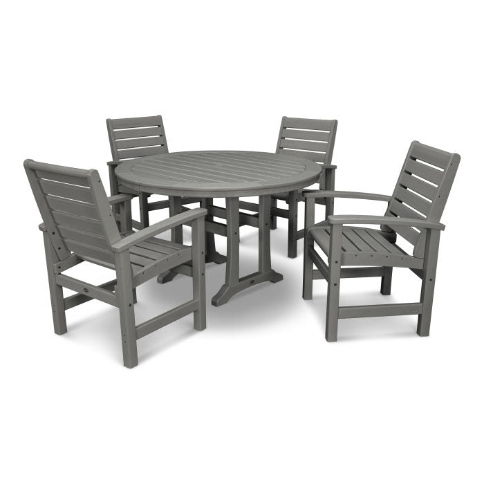 Create an intimate outdoor dining space with the Signature 5-Piece Nautical Trestle Dining Set. This all-weather set seats up to four guests and features a table top with rounded edges and space for plenty of legroom underneath. Paired with the clean lines of our Signature Dining Chairs, this set is sure to keep dinner conversations going long after dessert has been served.
